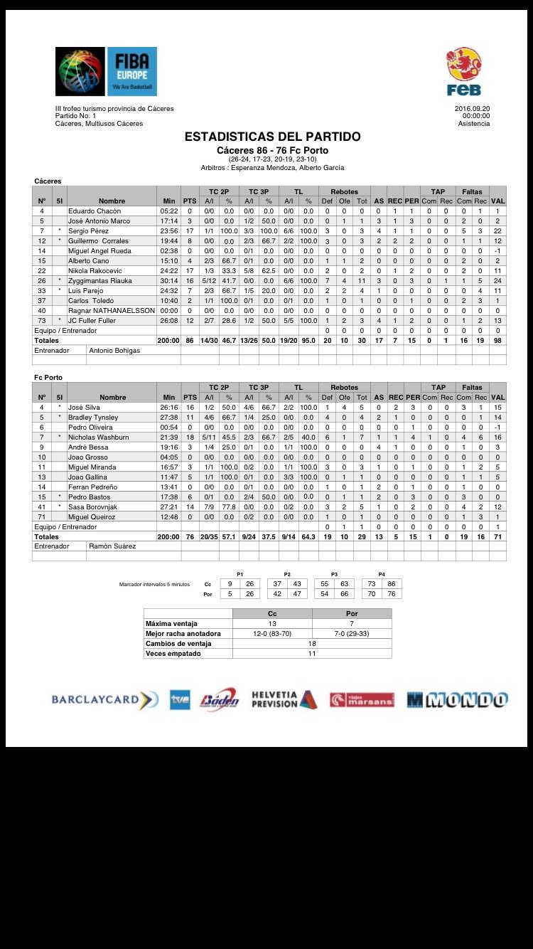 | 13-Set | Dragons Force FC Porto vs Cáceres | 92-74 | ||||