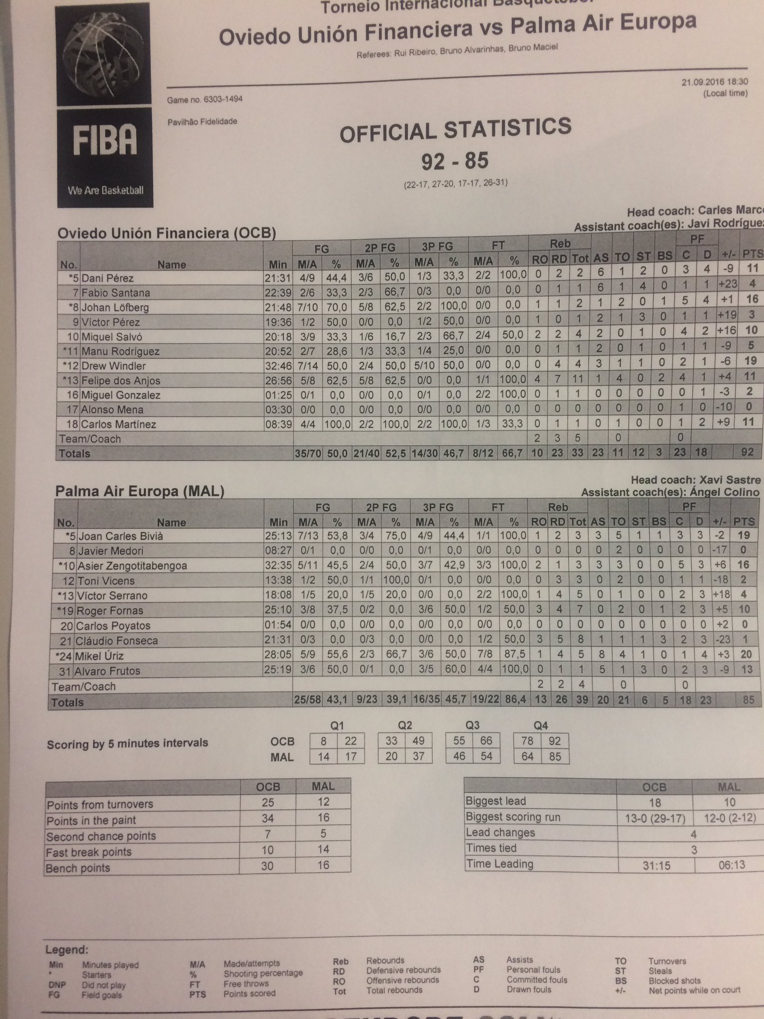 | 21-Set | Palma Air Europa vs UF Baloncesto Oviedo (T. Benfica) | 92-85 | ||||