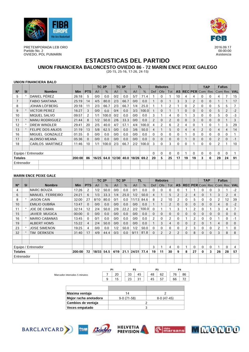 | 17-Set | UF Baloncesto Oviedo vs Marín Peixegalego | 86-72 | ||||