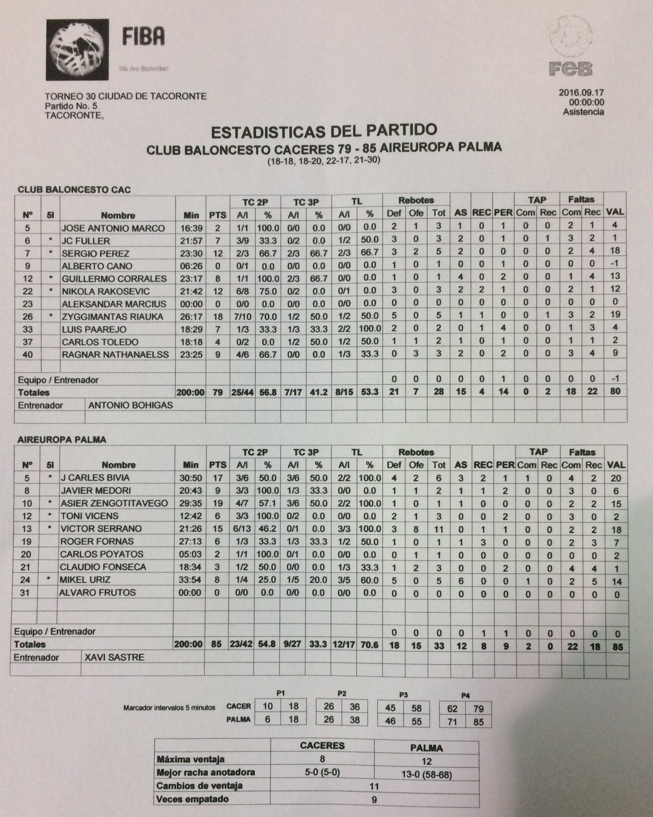 | 17-Set | Cáceres Patrimonio de la Humanidad vs Palma Air Europa (Final T. Taroconte) | 79-85 | ||||