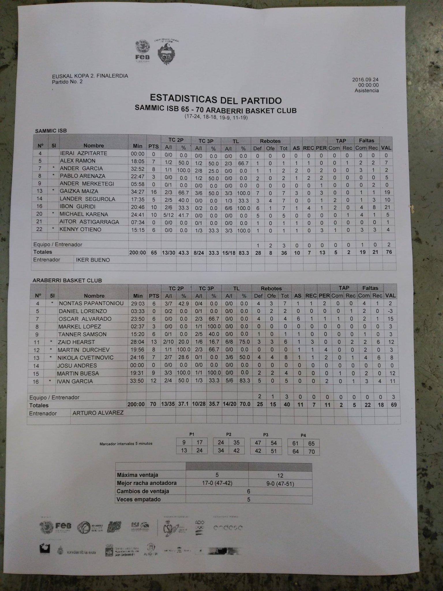 | 24-Set | Araberri vs Sammic ISB (Euskal Kopa LEB) | 70-65 | ||||