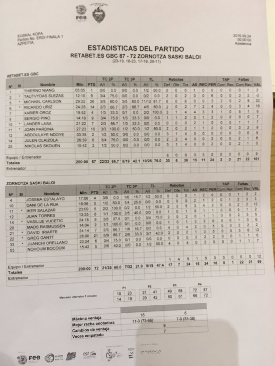 | 24-Set | RETAbet.es GBC vs Zornotza ST (Euskal Kopa LEB) | 87-72 | ||||