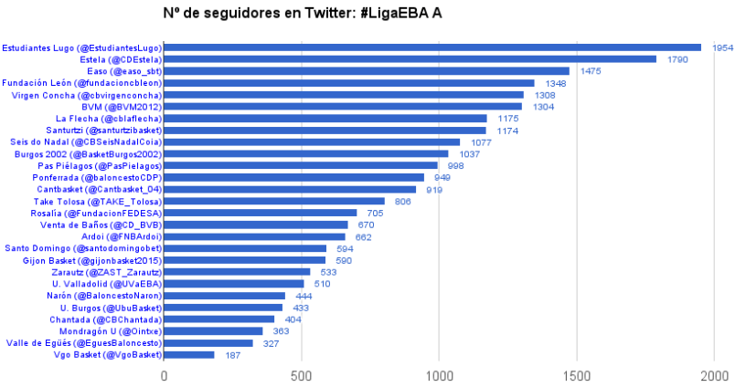 Más alla de los equipos de LEB Oro y Plata, cuyo seguimiento en twitter habíamos analizado hace dos semanas, queremos también comprobar cual es la implantación de los equipos de la Liga EBA A en esta red social. En esta conferencia compiten escuadras de seis comunidades autónomas (Galicia, Asturias, Castilla y León, Cantabria, Euskadi y Navarra), y de ciudades o pueblos de poblaciones tan dispares como pueden ser Vigo (unos 300.000) y Chantada (menos de 10.000) o Venta de Baños (unos 6.000). La implantación de estos equipos, su representatividad y su tradición son factores a tener en cuenta a la hora de tener más seguimiento en las redes sociales, pero no todo acaba ahí, pues el buen trabajo de los CM también puede ayudar a que los clubes de la cuarta división del baloncesto en España se hagan un hueco en este ámbito. Ahí está por ejemplo Vgo Basket, un club joven que también tiene una corta historia en twitter y que en los últimos días intenta conseguir nuevos seguidores a los que hacer llegar la información relativa al club. O Baloncesto Narón, cuyo buen trabajo de infografía y cuidada imagen le harían acreedor de un mayor número de seguidores.