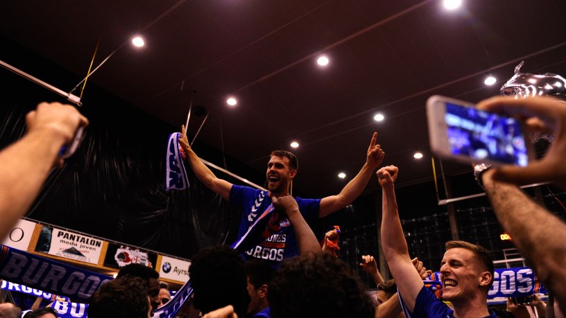 Más de 300 almas azules estuvieron en el Adolfo Nicolás alentando al CB Miraflores, con el que terminaron celebrando el cuarto ascenso deportivo a ACB conseguido por un equipo de Burgos (2 Tizona y uno Atapuerca).