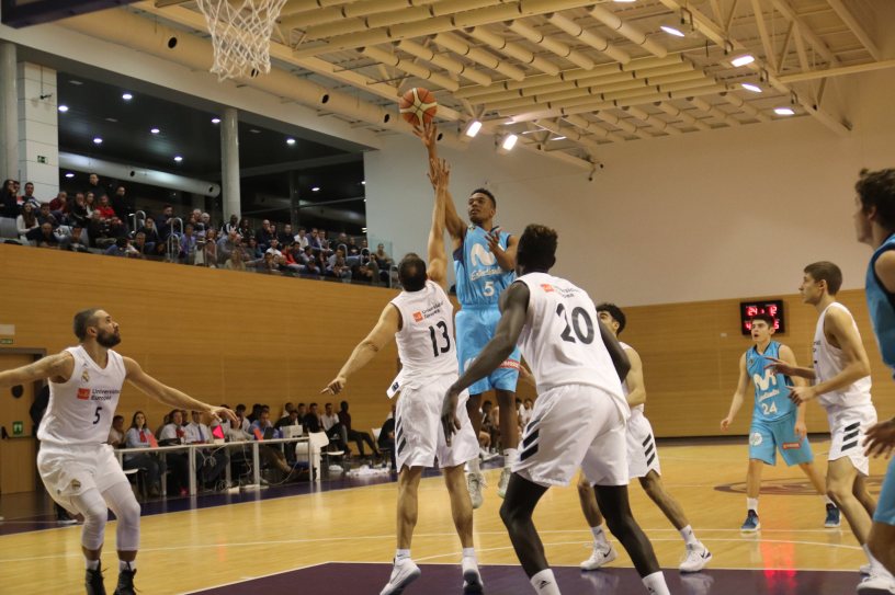El primer duelo de canteras ACB en Liga EBA esta temporada se decantó en la primera mitad del partido a favor del Real Madrid, que con una asfixiante defensa dificultó cualquier maniobra en ataque de Movistar Estudiantes.