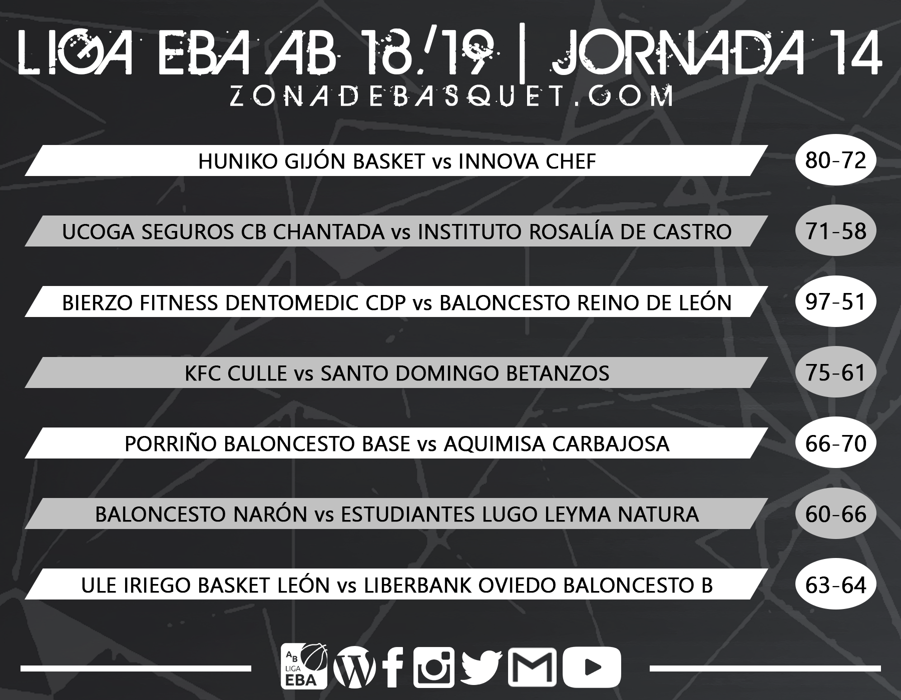 El baile en la cabeza del grupo AB de Liga EBA sigue siendo una constante esta temporada, con cambios en los equipos que lideran la tabla que, tras la jornada 14, como no podía ser de otra forma, vuelven a variar, pasando de cinco colíderes a tres, tras las derrotas de Basket León y Virgen de la Concha, que cotizan a la baja frente a los pujantes Culleredo, Ciudad de Ponferrada y Chantada. También por abajo cambia algo el panorama, con Oviedo y Carbajosa sumando importantes triunfos que les dan un ligero margen sobre la zona de descenso tras esta primera jornada de la segunda vuelta de la competición.