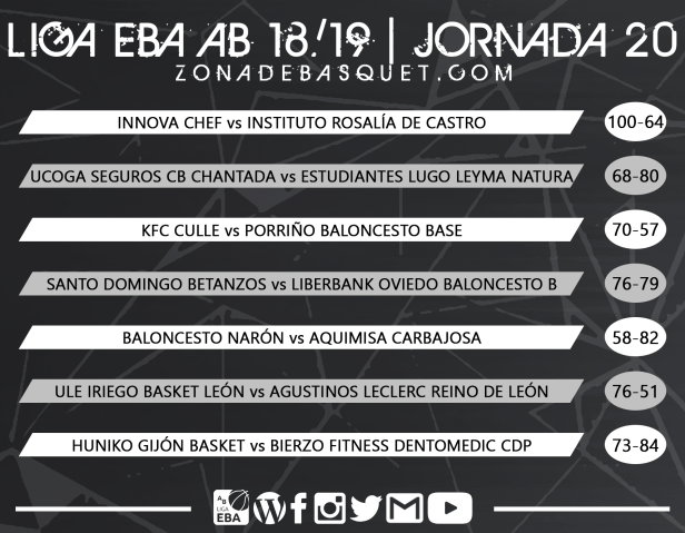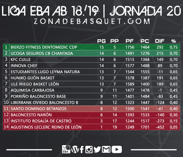 Una semana más continúa el baile en la zona alta de la clasificación del grupo AB de Liga EBA, pasando de dos equipos en cabeza a solo uno tras la jornada 20, que deja de nuevo a Ciudad de Ponferrada como líder en solitario tras el tropiezo de Chantada, manteniendo a siete equipos en dos victorias, a falta de solamente seis jornadas para el final de la liga regular. Por abajo las cosas se empiezan a clarificar, con Reino de León a punto de confirmar su descenso matemático y un corte ya de dos victorias entre el antepenúltimo clasificado, que sigue siendo Narón, y el equipo que marca la salvación, que pasa a ser Betanzos tras caer en el duelo directo frente al filial de Oviedo.