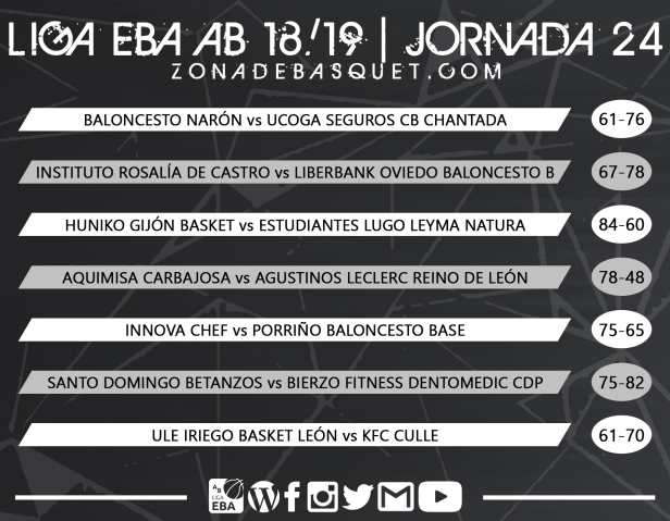 La igualdad ha sido la nota dominantes durante toda la temporada en el grupo AB de Liga EBA, pero en estas últimas semanas, un equipo ha logrado destacarse sobre el resto, los bercianos del Ciudad de Ponferrada, que han entrado en racha en el momento preciso, consiguiendo tras esta jornada 24, asegurarse su plaza para disputar la fase de ascenso y quedando a solo una victoria más de confirmar también su primera posición. En la lucha por la plaza restante, Chantada y Culleredo no fallaron, siguiendo firmes en una pelea que parece que mantendrá la emoción hasta el último momento, con Gijón y Virgen de la Concha al acecho. En cuanto a la zona baja, la victoria del filial de Oviedo complica las cosas para Narón, que ahora mismo tiene todas las papeletas para ser el tercer equipo descendido, después de que las últimas dos posiciones estén confirmadas para Rosalía de Castro y Reino de León.