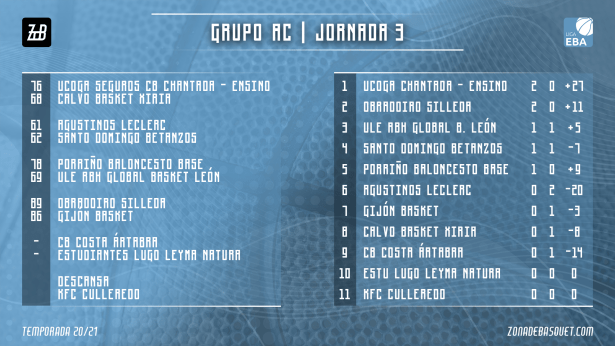 Sigue en marcha este Grupo AC de Liga EBA, que en su segundo fin de semana de competición disputó la jornada 3, cosas de esta época extraña marcada por el coronavirus, que provocó también la suspensión del duelo entre Costa Ártabra y Estudiantes Lugo. Con esta situación, entre los equipos que han podido disputar los dos primeros partidos, son Chantada y Obradoiro los únicos que consiguen mantener a cero su casillero de derrotas, algo que no pudo igualar Basket León, que cedió ante un Porriño que se estrenaba esta semana y lo hacía a lo grande, con una primera victoria que también conseguía Betanzos, aunque en su caso, para equilibrar su balance tras la derrota de hace siete días.