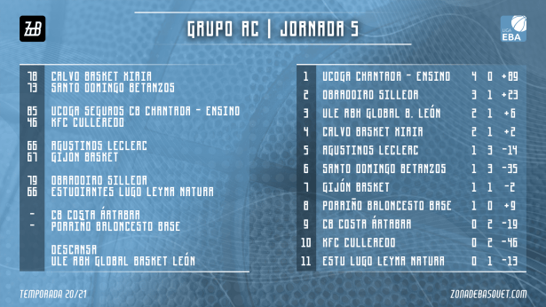 Siguen disputándose nuevas jornadas en el Grupo AC de Liga EBA, pero la situación del coronavirus mantiene la imposibilidad de que estas se disputen completas. Este fin de semana, la jornada 5 programaba cinco partidos y el descanso para Basket León, pero finalmente Costa Ártabra y Porriño tampoco pudieron disputar su choque, por lo que fueron solo cuatro los partidos disputados. Entre esos duelos, el de un Chantada que sigue intratable como líder invicto, y el de un Obradoiro que se recupera de la derrota de hace una semana y vuelve a la senda victoriosa para situarse a la estela de esa primera posición. Completaron el fin de semana las victorias de Xiria, que entra en racha positiva, y de Gijón, que inaugura su casillero de triunfos.