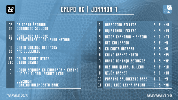 Tras haber tenido hace dos semanas la primera jornada disputada de forma íntegra nos las prometíamos muy felices, pero este fin de semana, la jornada 7 de este grupo AC de Liga EBA volvió a quedarse en solo tres partidos disputados, aplazándose los duelos entre Chantada y Basket León y el que debía enfrentar a Xiria y Gijón. Entre los duelos que sí pudieron disputarse, hay que destacar las victorias de Obradoiro y de Reino de León para ponerse ahora, a falta de que otros equipos recuperen partidos, en las dos primeras posiciones de la clasificación, siendo también importante un nuevo triunfo para Culleredo, que parece entonarse tras su difícil comienzo de temporada.