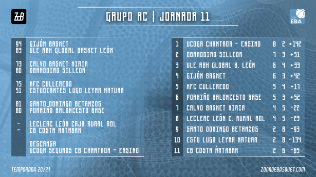 La disputa de la jornada 11 este fin de semana puso fin a una primera vuelta de la competición en el Grupo AC de Liga EBA que deja aún pendientes de jugarse varios compromisos, porque si algo ha sido común en estos meses, ha sido el aplazamiento de partidos debido a la situación con la pandemia del coronavirus, que antes o después han ido sufriendo los distintos equipos. Lo que es definitivo por ahora es que Chantada es campeón de invierno, pero la ventaja sobre el grupo de perseguidores formado por Obradoiro, Gijón o Basket León no deja opción a la relajación para los lucenses. Por abajo tampoco están las cosas claras, Betanzos, Estudiantes Lugo y Costa Ártabra son los equipos ahora mismo en las últimas posiciones, pero Reino de León, Xiria, Culleredo o Porriño están ahí también metidos en la pelea, por lo que la segunda parte de la competición se prevé apasionante, tanto en la parte alta como para eludir el descenso.
