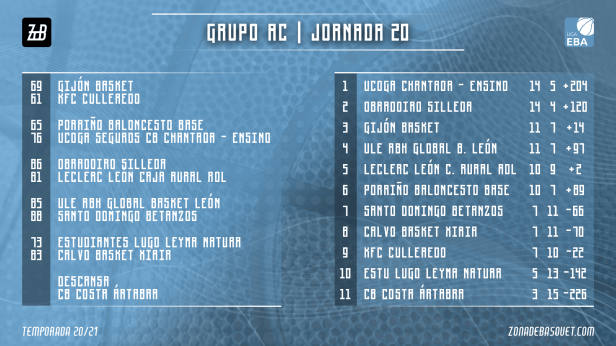 Tras el parón por la semana santa, se disputaba el pasado fin de semana la jornada 20 en el grupo AC de Liga EBA, que unida a los resultados dados en partidos que estaban pendientes y ya se han podido jugar, dejan de cara a las últimas dos jornadas un cara a cara entre Obradoiro y Chantada por el primer puesto, viéndose ambos conjuntos las caras en la próxima jornada en el duelo que definirá el liderato y por tanto el puesto de playoff. A alcanzar ese puesto ya no podrán optar ni Porriño, ni Basket León, ni Gijón, que finalmente no han logrado apurar sus opciones hasta el final, quedando en una zona intermedia ya sin objetivos, donde ya se encontraba Reino de León hace varias jornadas. Por abajo, con el descenso confirmado de Costa Ártabra, Estudiantes Lugo queda con opciones ya muy remotas de salvación, mientras que Betanzos, Xiria y Culleredo, ahora mismo empatados, tratarán de eludir ese noveno puesto que conlleva también la pérdida de categoría, al margen de posibles arrastres por descensos desde LEB Plata.