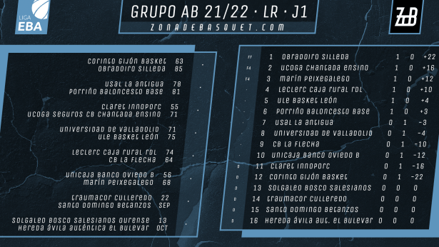 Este fin de semana se dio el pistoletazo de salida a una nueva campaña en el grupo A-B de Liga EBA, que recupera su tradicional distribución, como ya os contamos en la guía publicada hace unos días. Esta jornada 1 no se ha disputado en su totalidad, ya que los duelos entre Traumacor Culleredo y Santo Domingo Betanzos, y entre Solgaleo Bosco Salesianos y Hereda-Ávila Auténtica-El Bulevar están pendientes, disputándose el primero este mismo miércoles y el segundo en el próximo mes de octubre. En el resto de la jornada, de seis partidos jugados, cinco se saldaron con victoria visitante, lo que da una idea de la competitividad que se espera durante un año en el que Obradoiro, Chantada, Marín, Reino de León, Basket León y Porriño han comenzado con victorias, empezando así a mostrar sus credenciales para intentar estar lo más arriba posible.