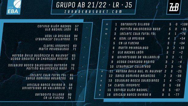 Poco a poco se va clarificando la parte alta de este grupo A-B de Liga EBA. Tras la disputa este fin de semana de la jornada 5, solo Reino de León y Tormes se quedan a la estela de la dupla de líderes invictos que siguen formando Obradoiro y Porriño. De ese grupo de perseguidores caen La Flecha y Chantada, que quedan en zona media junto a Marín, Basket León y Universidad de Valladolid. Mirando ya hacia la parte baja, con dos victorias se sitúa Óbila junto a Culleredo y Betanzos, mientras que Bosco Salesianos solo cuenta con un triunfo en su cuenta, justo por encima del filial de Oviedo, Gijón Basket y Claret, que son los equipos que hasta el momento cuentan sus partidos por derrotas.