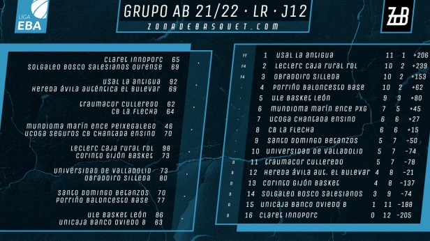 Esta semana de puente festivo nos trae hasta tres jornadas en este grupo A-B de Liga EBA, siendo la primera la disputada este pasado fin de semana. Una jornada 12 que no deparó grandes cambios en las zonas calientes de la clasificación, con victorias de los siete primeros clasificados, siendo los gallegos de Bosco Salesianos los únicos que pudieron vencer en la zona baja. En cuanto a los primeros, Tormes sigue firme en su racha positiva, y Reino de León, Obradoiro y Porriño se mantienen al acecho, con Basket León en quinta posición con una victoria menos que los perseguidores del líder. Chantada volvía a vencer y lidera la zona templada, seguido de La Flecha, que sumó un importante triunfo esta semana.
