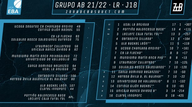 Poco a poco va recuperándose algo la normalidad respecto al covid, y en esta jornada 18, solamente un partido ha necesitado ser aplazado en el grupo A-B de Liga EBA, pudiéndose disputar el resto de la jornada con normalidad. Tormes sigue sin aflojar en cabeza, cada vez más consolidado como líder, y por detrás, Obradoiro y Basket León volvían a la senda de la victoria para tratar de apretar la pelea por la segunda y tercera posiciones. En la zona media, La Flecha y Marín sumaban importantes triunfos para intentar mantener diferencias con los puestos de descenso, una zona en la que fue buena jornada para los equipos asturianos, ya que tanto Gijón como el filial de Oviedo sumaban y tratan así de mantener sus opciones de salvación.