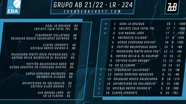 La disputa durante el fin de semana de la jornada 24 en el grupo A-B de Liga EBA nos deja a un Tormes que se asegura virtualmente el liderato, ya que restando seis jornadas, saca idéntica ventaja al segundo clasificado, con el básquet average a su favor, por lo que solamente Obradoiro, que tiene pendiente un partido aplazado, podría dar caza a los salmantinos si estos caen en todos sus choques y los gallegos consiguen hacer pleno de victorias. Pese a que esta pelea por ser campeón está prácticamente liquidada, queda mucha emoción en estas jornadas finales tanto en la zona alta como por abajo para evitar el descenso. Arriba, los equipos leoneses ocupan ahora mismo zona de playoff, pero Obradoiro y Chantada vienen apretando mucho para ocupar ese segundo y tercer puesto, para los que Porriño ha perdido algo de terreno. En la zona baja, con Claret descendido, el filial de Oviedo trata de apurar sus escasas opciones, mientras que Culleredo y Gijón Basket también explotan su buena racha para subir posiciones. Marín logra igualmente mantener distancias con esa zona roja tras una victoria importante.
