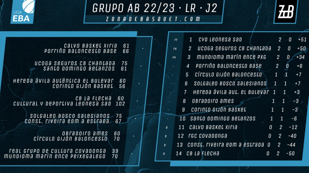 Nuevo fin de semana de baloncesto en el grupo A-B de Liga EBA, disputándose la jornada 2 de la competición, tras la cual, cuatro son los equipos que se mantienen invictos con pleno de victorias, destacando la apabullante exhibición ofensiva de la Cultural Leonesa, y también la gran actuación, en este caso defensiva, de Marín. Además, Chantada y Porriño también se mantienen en este grupo cabecero, mientras que Círculo Gijón, Bosco Salesianos y Óbila, sumaron su primer triunfo liguero. Por abajo, son también cuatro los equipos que aún no han saboreado victoria alguna, Xiria, Grupo Covadonga, A Estrada y La Flecha, que cuentan sus dos encuentros hasta el momento por derrotas.
