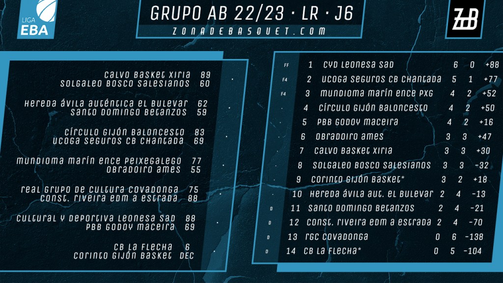 Siguen pasando las semanas en el grupo A-B de Liga EBA, y poco a poco se clarifica la cabeza de la clasificación, que, tras la disputa de la jornada 6, se reduce a un único equipo, la Cultural Leonesa, que mantiene su imbatibilidad y se aprovecha de la derrota de Chantada para liderar en solitario. Por detrás de leoneses y gallegos, Marín y Círculo Gijón atrapan a Porriño en la tercera posición y miran hacia arriba, mientras Xiria, Obradoiro, Bosco Salesianos y Gijón Basket se mantienen en zona media, aunque los asturianos aún no han disputado el partido de esta jornada ante La Flecha, aplazado para diciembre, por lo que los de Arroyo de la Encomienda siguen en el fondo de la clasificación, sin conocer la victoria hasta el momento, lo mismo que el Grupo Covadonga, viendo como los rivales inmediatos abren un hueco ya de dos victorias, con las que figuran Betanzos, A Estrada y Óbila.