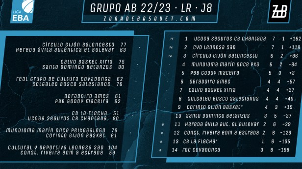 Semana sin sorpresas en la parte alta, con victoria para los cinco primeros clasificados, que mantienen así posiciones tras la disputa de esta jornada 8 en el grupo A-B de Liga EBA. No fallaron Chantada y Cultural Leonesa, que llegarán como colíderes al duelo que disputarán el próximo fin de semana, mientras que por detrás, al acecho se mantienen, con una victoria menos, Círculo Gijón y Marín. Porriño se llevó el duelo ante Obradoiro y lucha por no descolgarse de la cabeza, quedando algo más atrás ya Xiria, Bosco Salesianos, Gijón Basket o el propio Obradoiro. Por abajo, solo Betanzos logró sumar, por lo que Grupo Covadonga se mantiene como colista y sin conocer la victoria aún, y La Flecha, A Estrada u Óbila continúan con sus problemas para sumar triunfos.